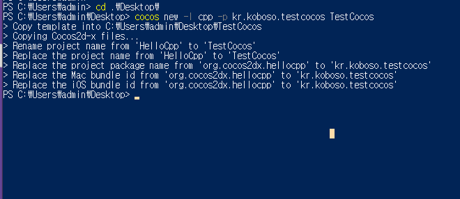 $ coocs new -l cpp -p kr.pe.koboso.testcocos TestCocos