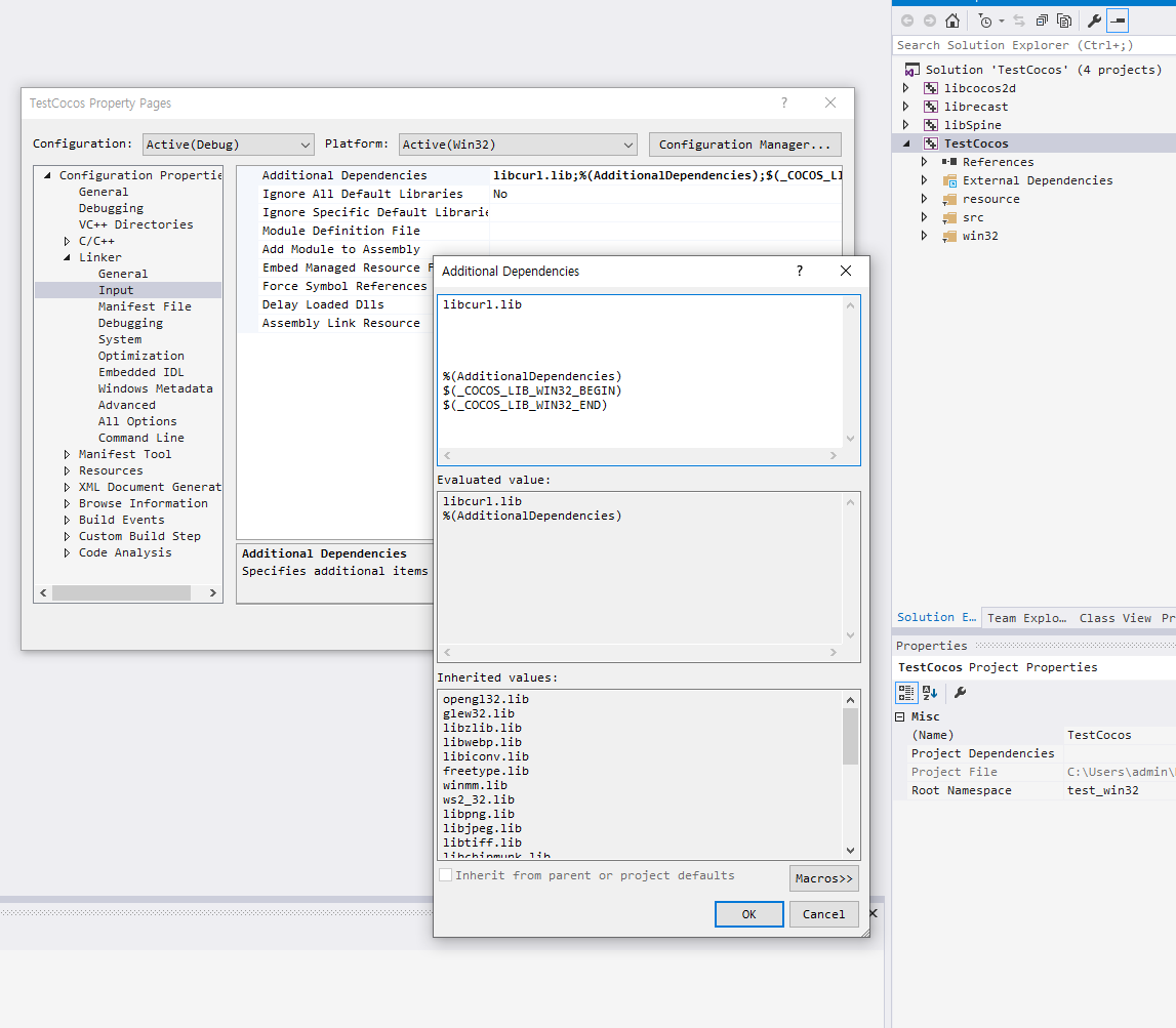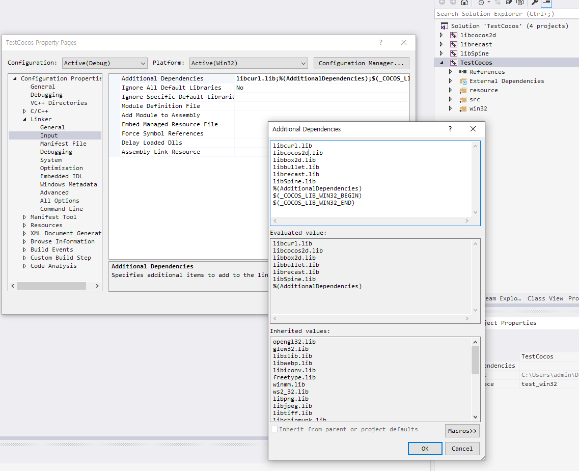 - Configuration Properties -> Linker -> Input -> Addtional Dependencies