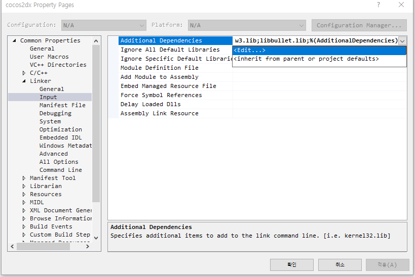 Common Properties -> Linker -> Input -> Addtional Dependencies -> edit