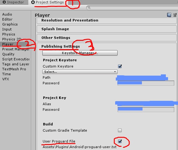 Project Settings -> Player -> Publishing Settings -> User Proguard File