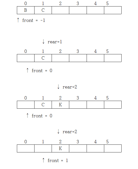 데이터의 삽입과 삭제를 위해 2개의 연산잔 Front, Rear 가 필요로 하며, Front 는 삭제의 위치 끝을 가리키며, Rear 는 삽입되는 위치의 끝을 가리킨다.