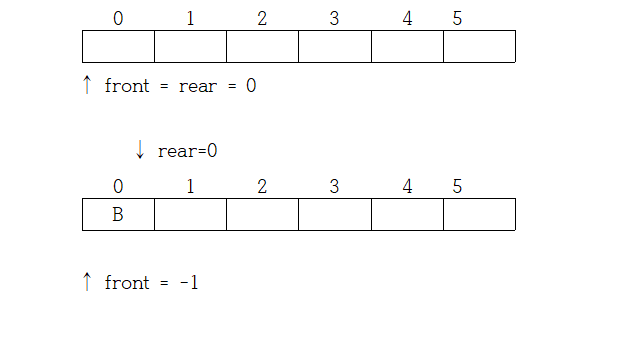 데이터의 삽입과 삭제를 위해 2개의 연산잔 Front, Rear 가 필요로 하며, Front 는 삭제의 위치 끝을 가리키며, Rear 는 삽입되는 위치의 끝을 가리킨다.