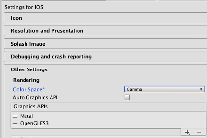1-2. Graphics APIs -> Metal -> + ->Add  "OpenGLES3"  or "OpenGLES2 "
