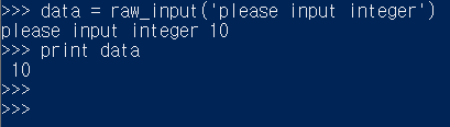 ★ raw_input : 입력받은 데이터를 문자열(텍스트)화 하여 입력됩니다. 유저가 10 데이터를 입력해도 10은 숫자가 아닌 문자열(텍스트) 타입입니다.
