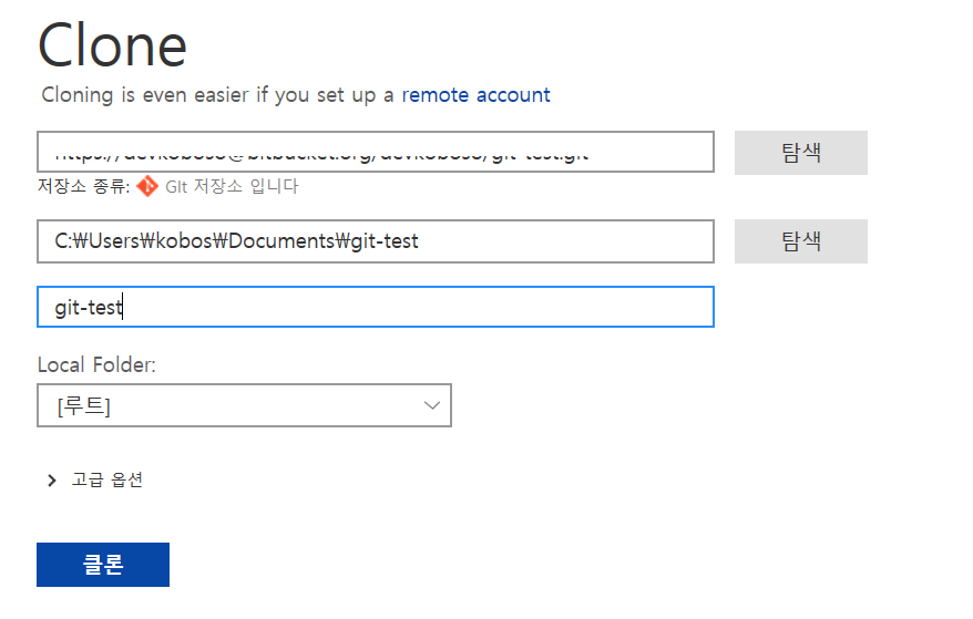아까 만들어놓은 비트버킷에 있는 리파지토리에 클론을 클릭해준다.