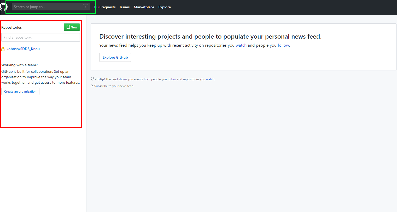 빨간색 사각형 영역 : 현재 내가 만든 저장소 리스트가 보여진다.