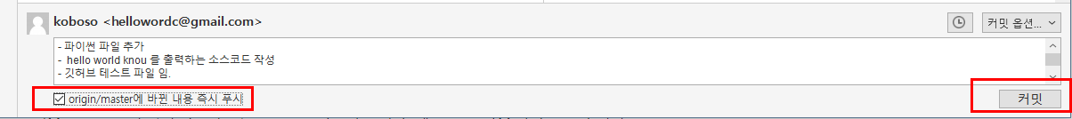 설명을 작성하고, 바뀐내용 즉시 푸시 를 체크하고 커밋을 누른다.