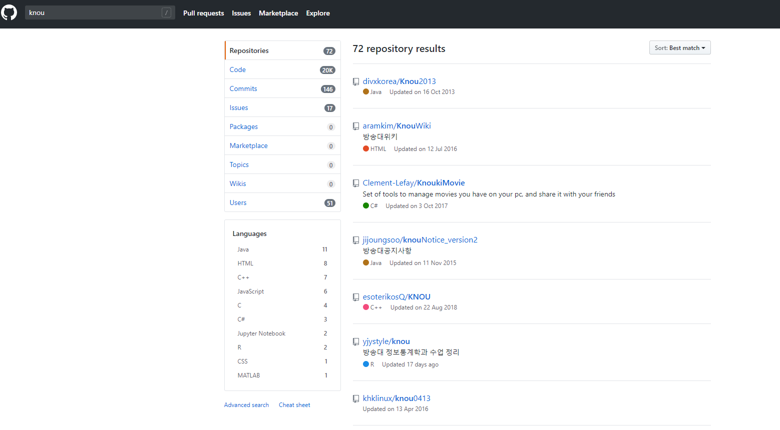아래는 knou 키워드로된 코드를 검색한 결과이다.