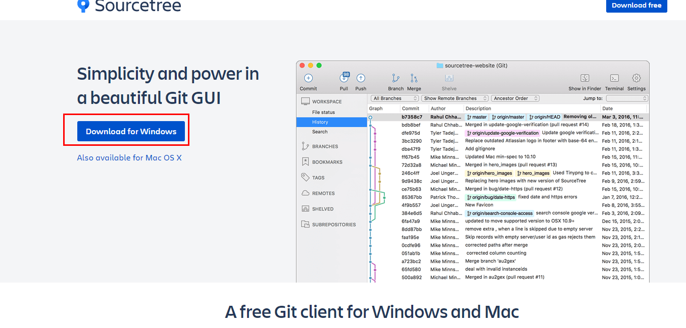 A Git GUI that offers a visual representation of your repositories. Sourcetree is a free Git client for Windows and Mac.