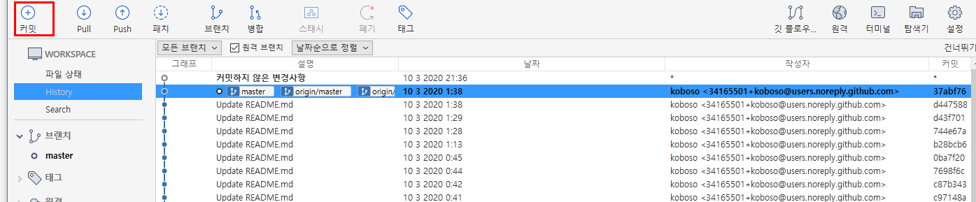 설명을 작성하고, 바뀐내용 즉시 푸시 를 체크하고 커밋을 누른다.