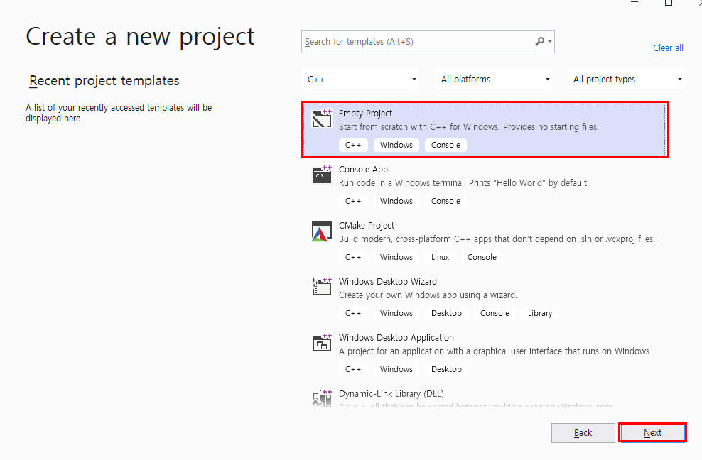 Empty Project 를 선택해야합니다.