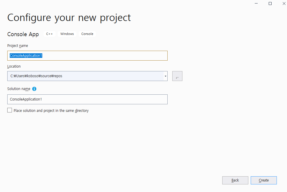 프로젝트 이름, 솔루션 이름은 영문으로 합니다.