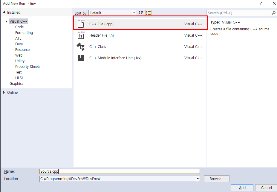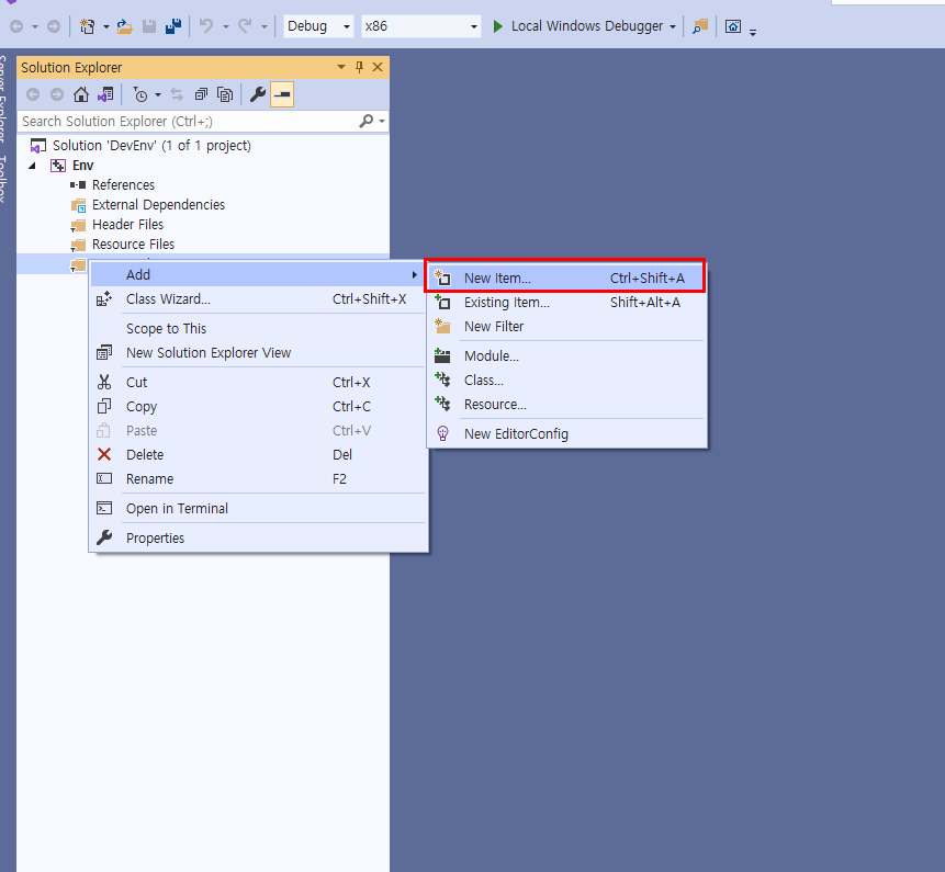 Source Files폴더를 마우스 우측 클리하여 Add -> New Item을 추가해줍니다.