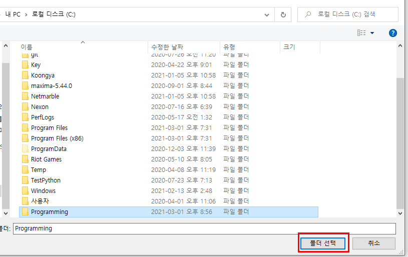 위치 경로는 C:\ 에 Programming 폴더를 만듭니다.