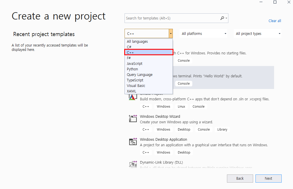 - C++를 사용한 데스크톱 개발 을 선택합니다.