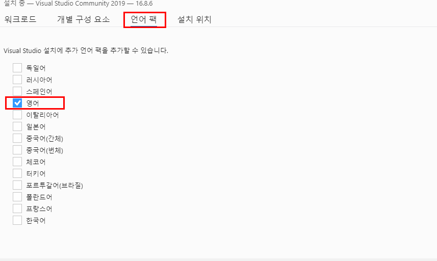 다음은 언어팩 탭에서 한국어를 언체크 하고, 영어로 체크합니다.