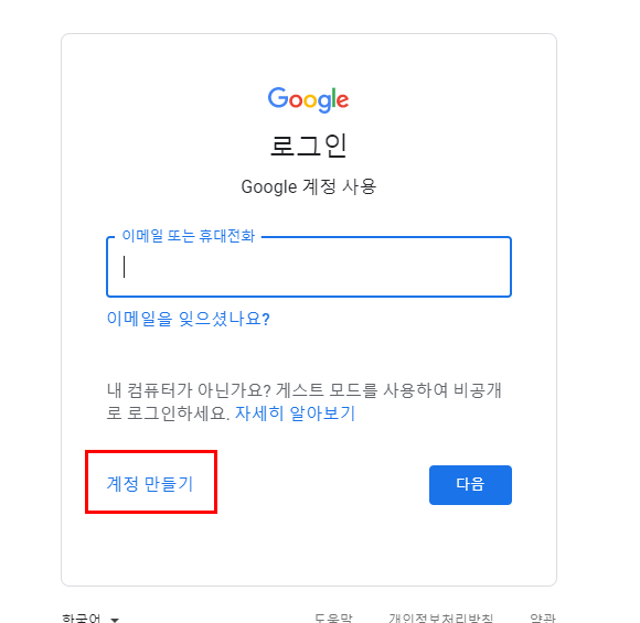 계정 만들기 로 들어갑니다.