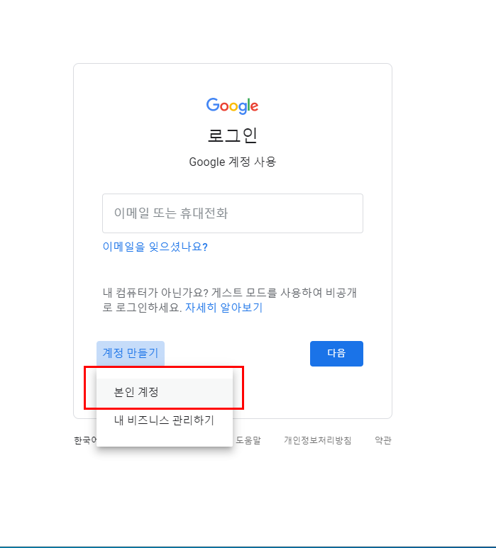계정 만들기 로 들어갑니다.