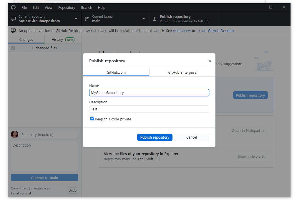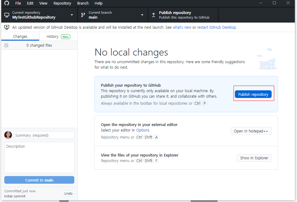하지만 저장소가 로컬( 내컴퓨터에만 있음) 에 있는상태이므로 아래 화면에서 publishing 해줘야한다.