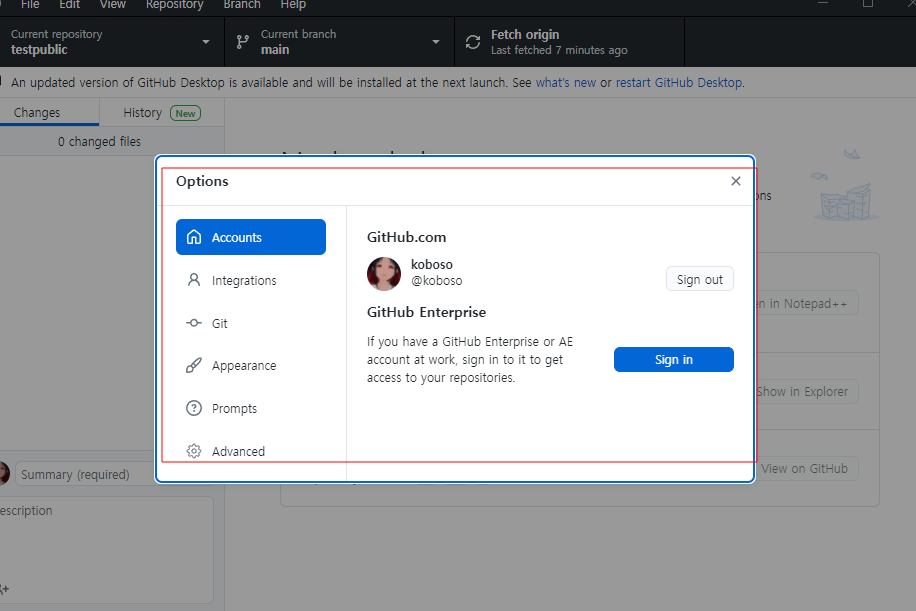 다시 옵션에 들어가면 로그인이 정상 된걸 확인할수 있다.